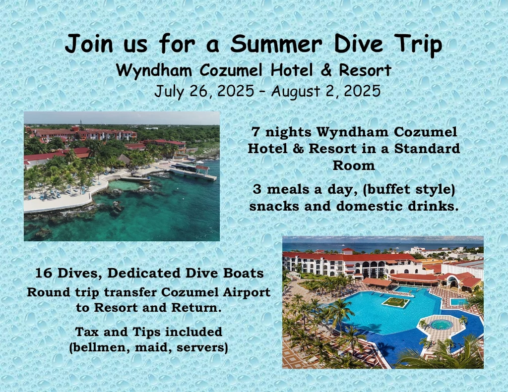 This wiggled in a second trip, back to Cozumel, but this time to Hotel Cozumel. Well lets just say WOW, what a great resort, fun people and so close to town.Our group of 28 had a blast. Lots of our younger divers on this trip. We even mananged to get some traingin in with divers completing Advanvced, Nitrox, and Master Diver. Nightly entertainment, good food and easy access for shore diving as well as boat diving. Check out our pictures on Facebook at https://www.facebook.com/likedafish/.